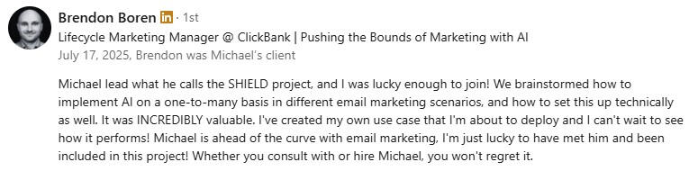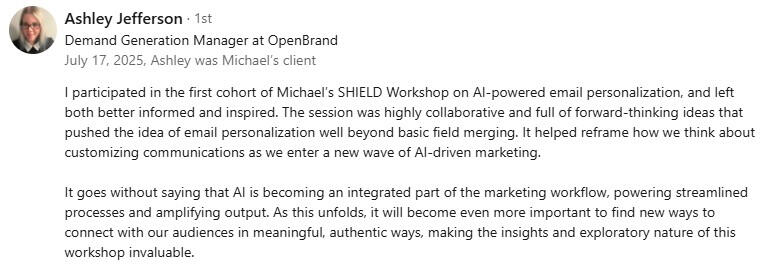 Join the Scalable, Hyper-Personalized Implementation of Email & Lifecycle Development Workshop.It is designed for email marketers who want to implement true 1:1 personalization using AI, at scale. It includes two 90-minute sessions: one session on the technical implementation and one on the strategic planning.The next workshop begins October 14th, 11am MT. (If that doesn't work, I can add you to the next).